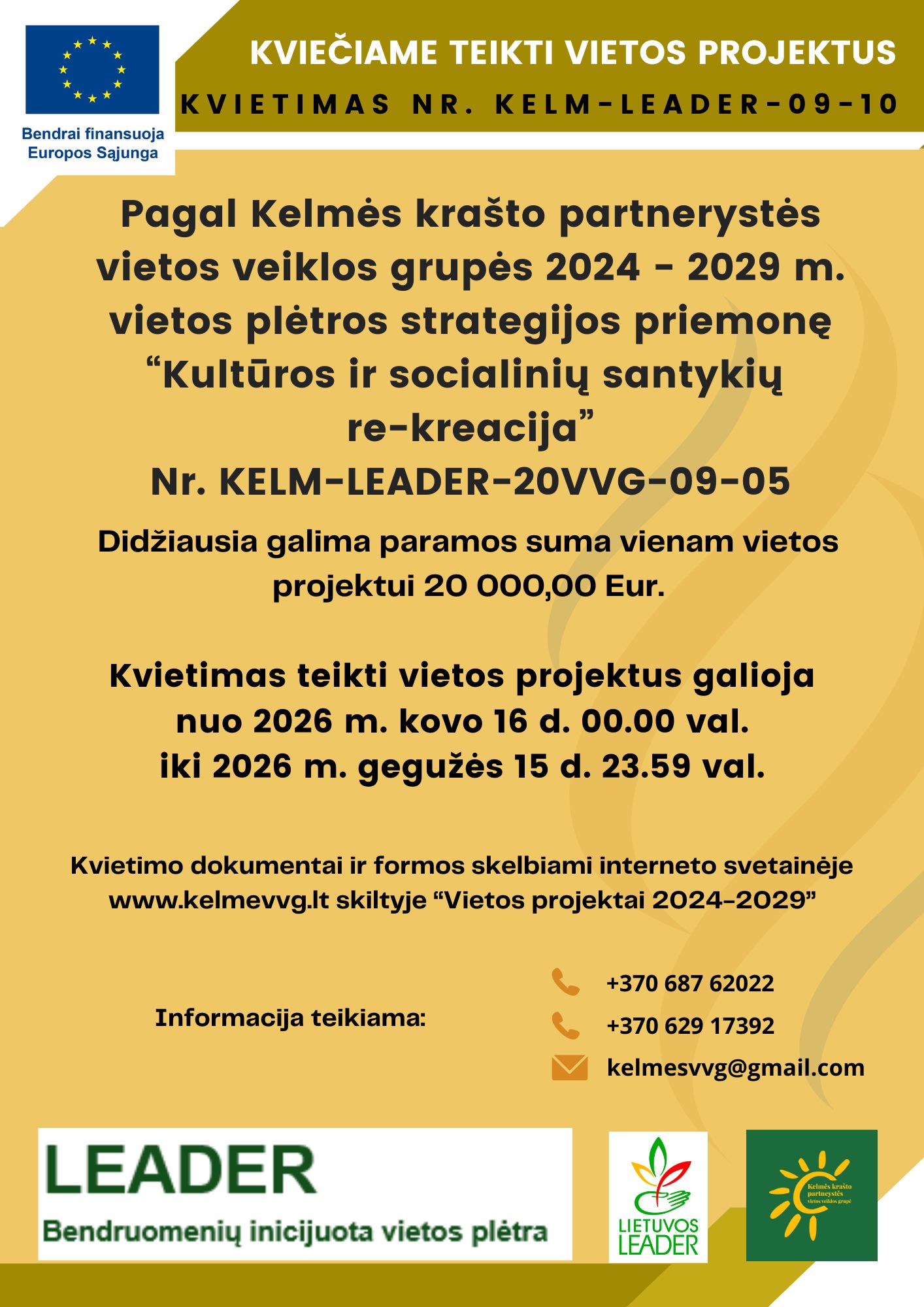 Kvietimas teikti vietos projektus Nr. KELM-LEADER-09-10 pagal Kelmės krašto partnerystės vietos veiklos grupės 2024 – 2029 metų vietos plėtros strategijos priemonę „Kultūros ir socialinių santykių re-kreacija“ Nr. KELM-LEADER-20VVG-09-05 galioja nuo 2026 m. kovo 16 d. 00.00 val. iki 2026 m. gegužės 15 d. 23.59 val.